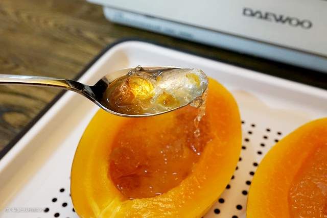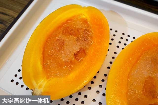 这是带直喷式+底盘式蒸汽的大宇蒸烤炸一体机做出来的,蒸汽通过微电脑芯片控量,全面覆盖整个内腔,成品效果相当不错。尤其木瓜果肉部分,甚至比美的R3蒸的更软糯,颜值口感俱佳。