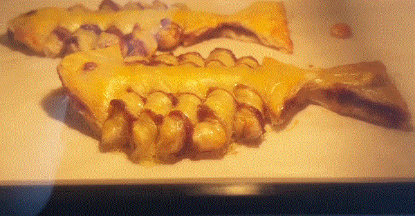►手抓饼无需解冻,趁着硬邦邦的时候,在塑封膜上画一条鱼的形状剪出来,2个一组。