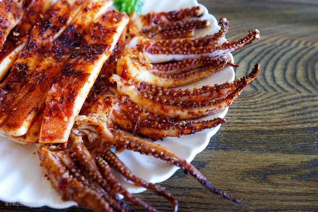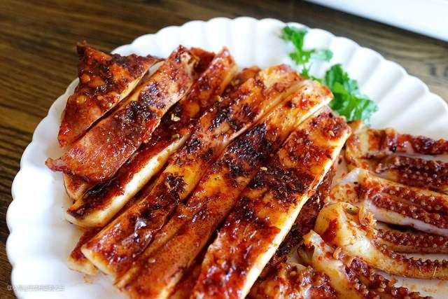 出炉后烤鱿鱼的味道香气浓郁,再撒点酱料和白芝麻,我觉得比烧烤店的还好吃!