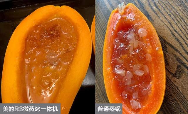 这是我平时常做的雪燕木瓜羹,用到的就是纯蒸模式。左边是带直喷式蒸汽的美的R3微蒸烤一体机做出来的,木瓜果肉部分的水分被完美的保留。再看右边普通蒸锅做的,木瓜果肉的状态和汁液的析出对比还是很明显的。