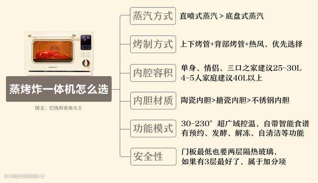 先来一张简单直白的总结图,保证大家一看就懂,建议收藏哦~下面我们具体聊聊选购蒸烤炸一体机的核心要点。