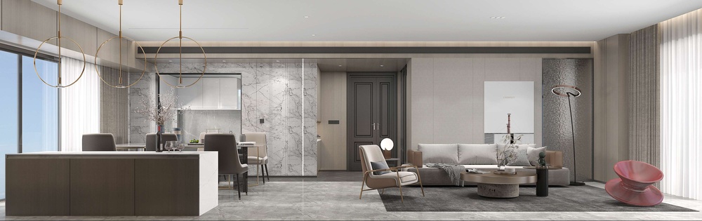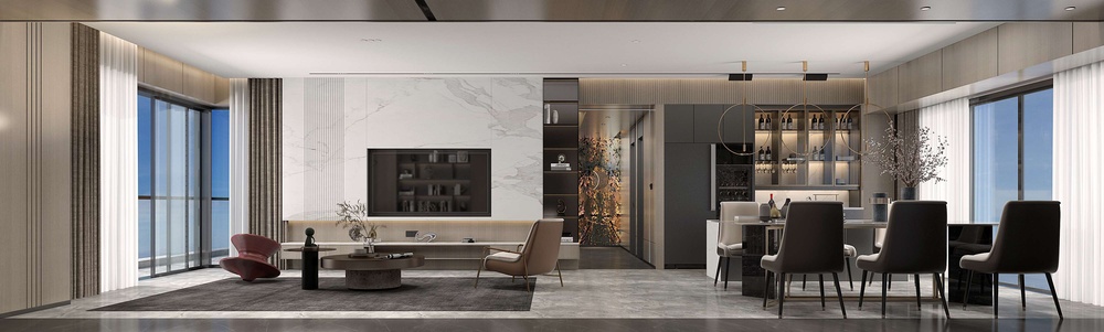 我们关于香山美墅·云邸项目的设定,亦是以此为基础,探索精致、独立、自然、人文的精神体验家居空间,提升生活品质感与空间温度,让家人之间的互动存在更多可能。轻奢风格的设计兼具东方含蓄与西式优雅,显露低调奢华的沉稳气质。阔敞的空间让各类生活区间得以自由独立呈现,客厅大面积的木饰面背景与简单干净的家居形成半围合式通透布局,增强空间内部视界。书房与客厅为邻,步入玄关即可看到通体墙面打造的书柜设计,起则便于待客,坐则安然乐己。主卧的设计,意在强调舒适、品质与宁静的氛围,同时彰显时尚与品位。背景墙面折叠的造型丰富了空间的视觉效果。