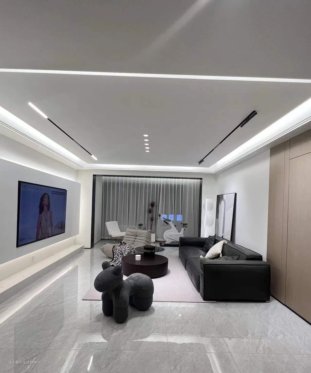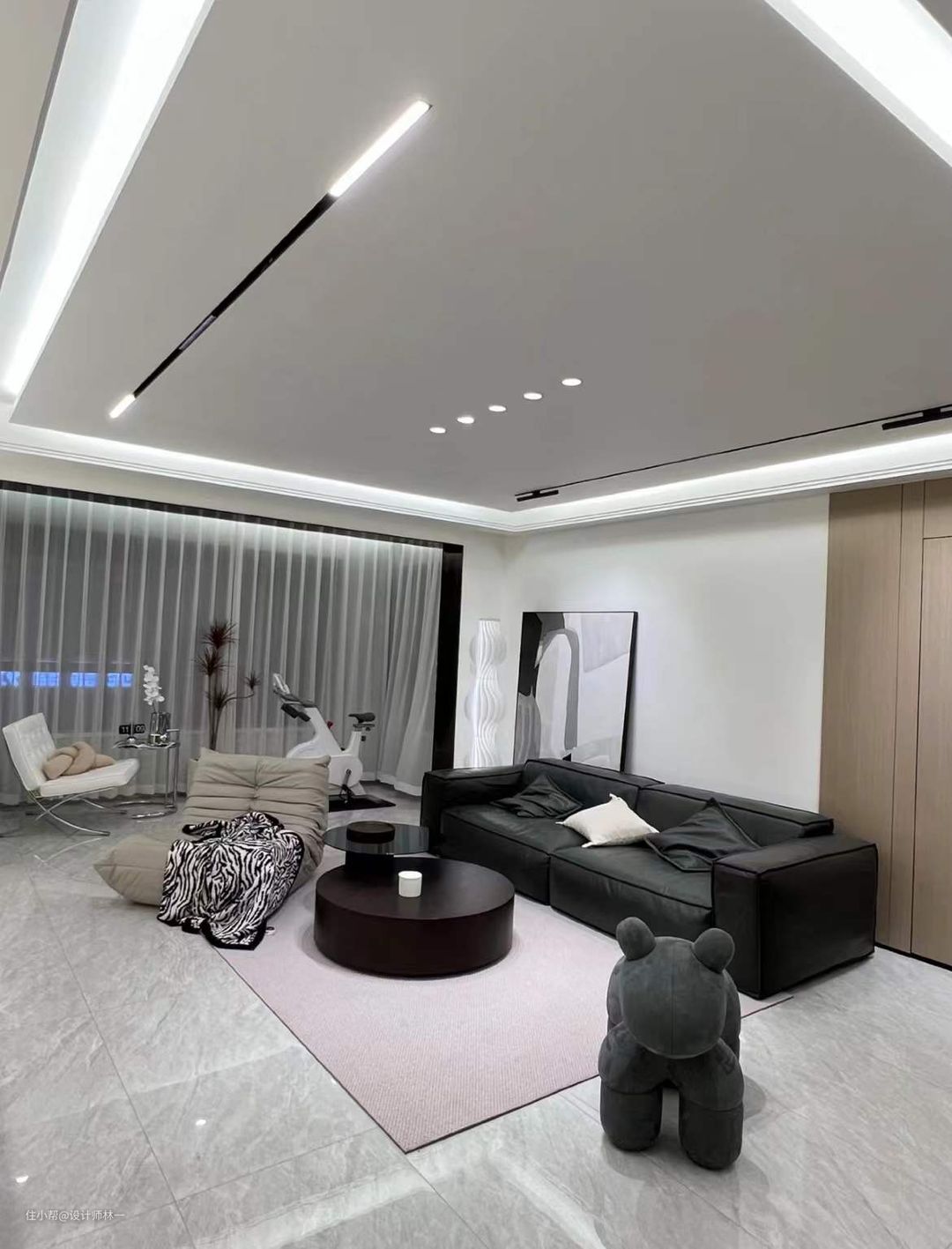 客厅悬浮吊顶下吊12cm,做了双层石膏板,6cm反光灯槽,看起来非常有质感,边吊下吊24cm,第一层退回完成面22cm,第二层退回去完成面20cm(2cm的错层更极简),顶面造型更加丰富,极大的增强了视觉感染力,使顶面处理富有个性,从而体现独特的装饰风格;