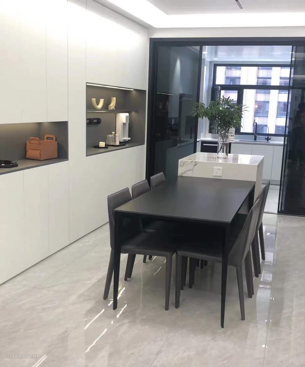 餐厅选择使用了黑色的岩板餐桌,表面无孔,不吸水,不吸收液体,表面光滑洁净,易于清除顽固污渍,具有很高的功能和实用性,黑色给人神秘又高级的感觉,质感满满。