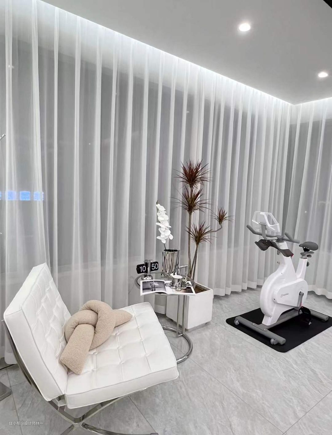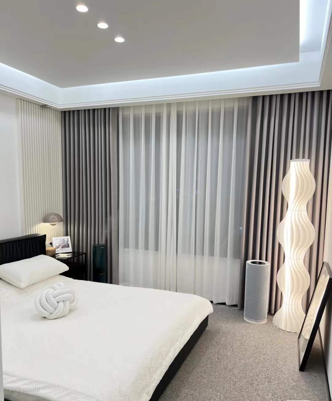 全屋大白墙,环保不易过时,窗帘是纯色精梳棉材质,做了2倍褶皱,搭配简单没有纹路的白纱帘,垂感十足,简约又大气。