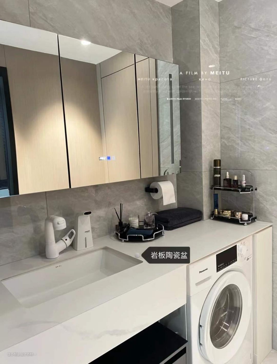浴室柜没有做挡水条,挡水条其实就是遮盖缝隙的,不用挡水条需要注意前期施工墙要找平归方(注意选择墙排下水,既美观又没有卫生死角,但墙排下水尺寸要准确哦),黑色搭配银色的亚克力金属收纳架,质感做工精致,非常适合极简风。
