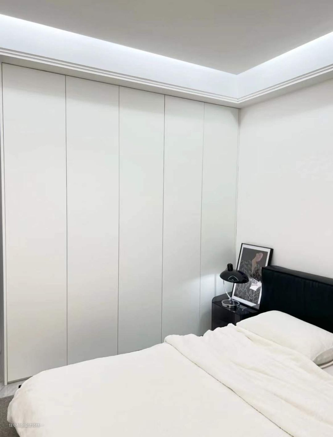 定制了顶天立地的衣柜,PET白色肤感板,柜体是白色实木多层板,柜门总高240cm,总长225cm,单柜门宽45cm,柜门距顶5mm,无把手设计采用了反弹器,实用又方便,每个柜门板安装了拉直器,后期不用担心变形。