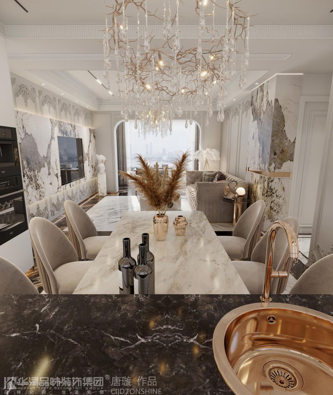 在这个空间中,墙体上使用了大量的花纹大理石并融入了很多欧式装饰花纹。让古典的人文与自然相结合,展现出一种和谐优雅的气质。在客厅和厨房都使用了华丽的水晶吊灯,更让整个空间有了奢华的气质。