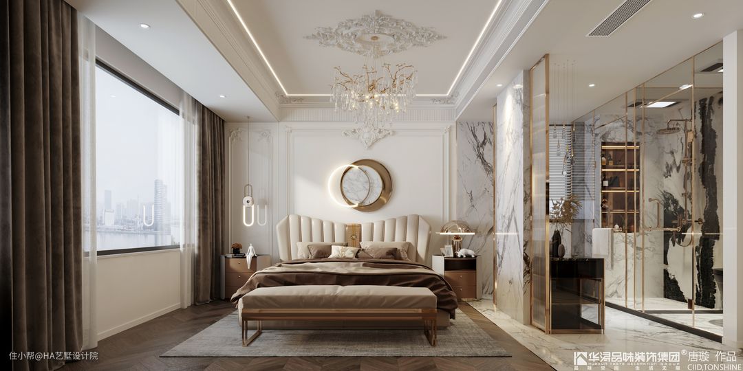 主卧室内通过短墙体加玻璃幕墙的方式,将主卧分成了多个不同的功能区域。在靠近窗户的位置,设为主卧室的睡眠区。在这里同样使用了大量欧式风格的设计元素,包括吊顶中间繁杂的花纹、床头背景墙上复杂的雕花线型以及曲线造型的欧式床头,这些设计都让卧室充满了欧式风情,更符合业主的审美要求。