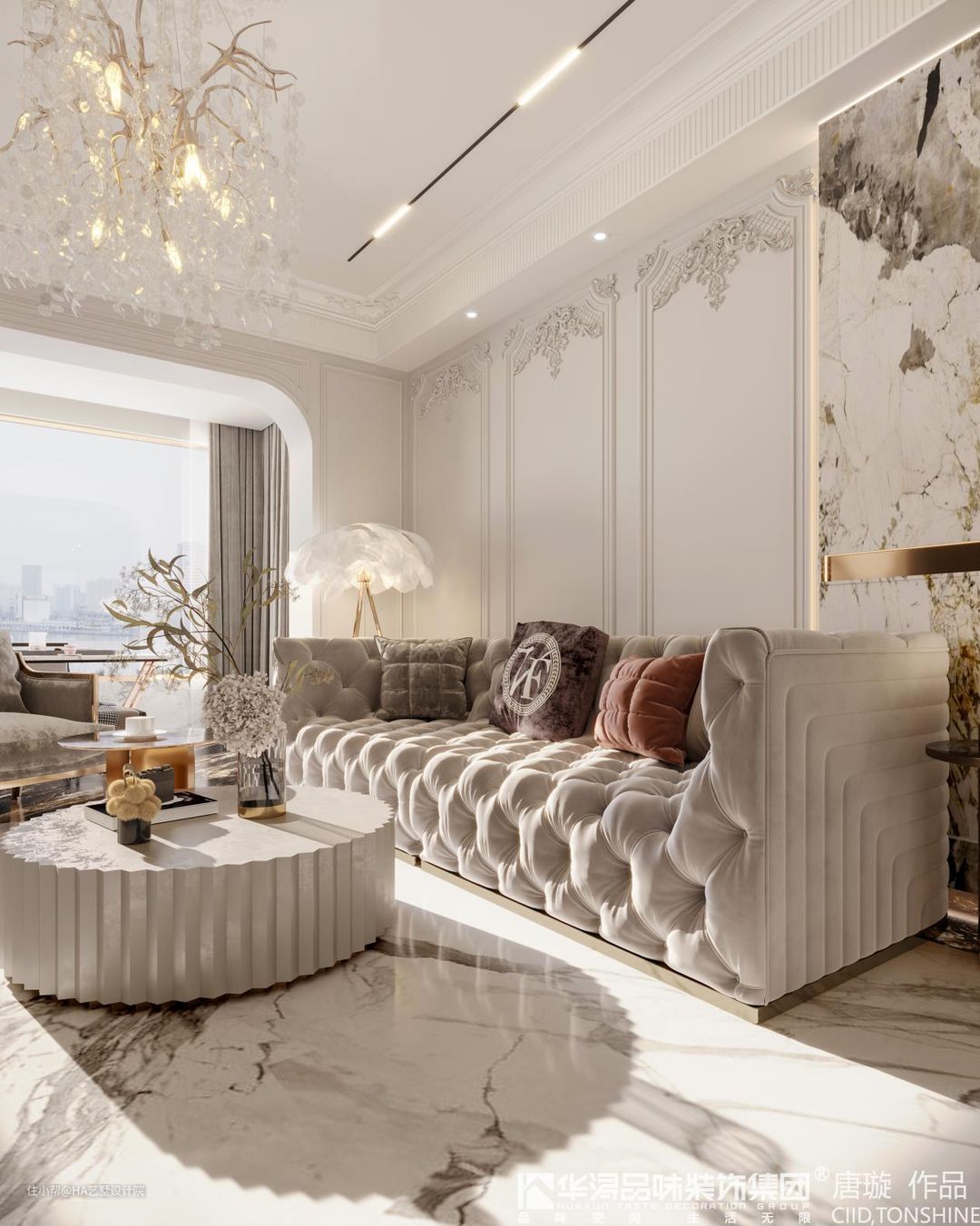 2业主喜欢大理石的质感,所以这套别墅设计时,要多用白色大理石进行铺装。