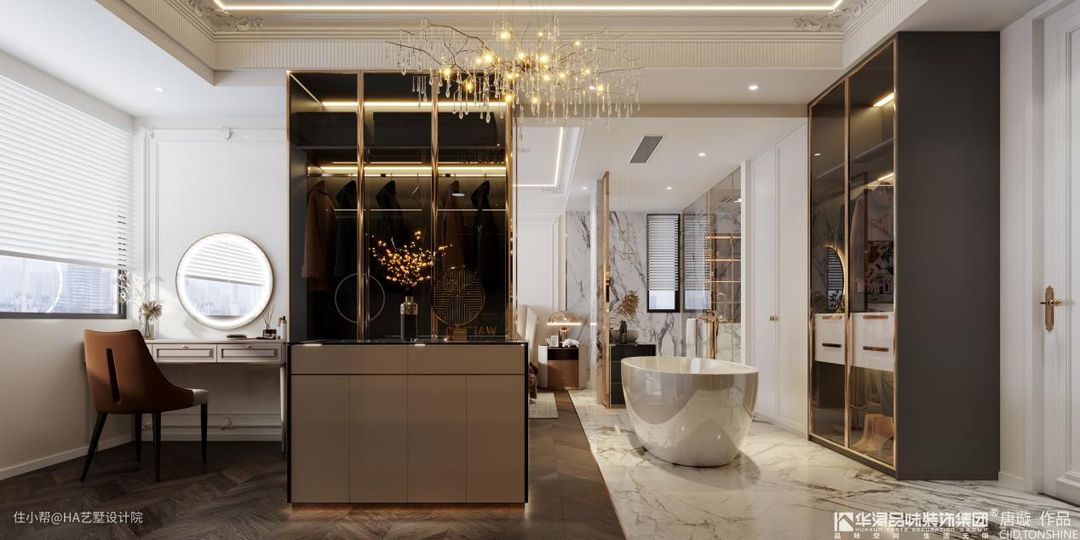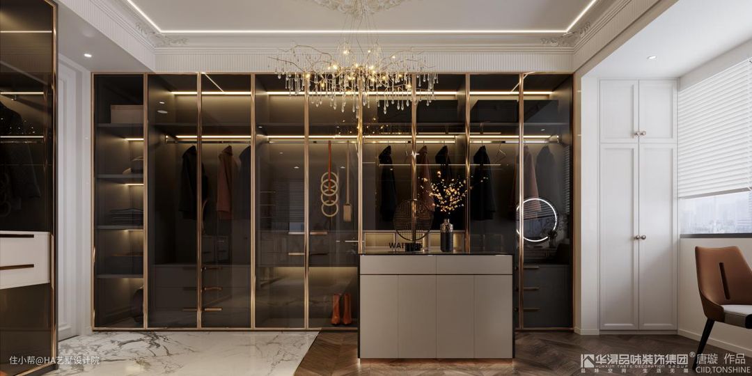 而衣帽间一整排的衣柜,都使用了通透的玻璃门板,并在内部安装了灯光,在灯光开启时,即使不打开玻璃门,衣柜里的衣服也会清晰的呈现在眼前,特别方便业主搭配。