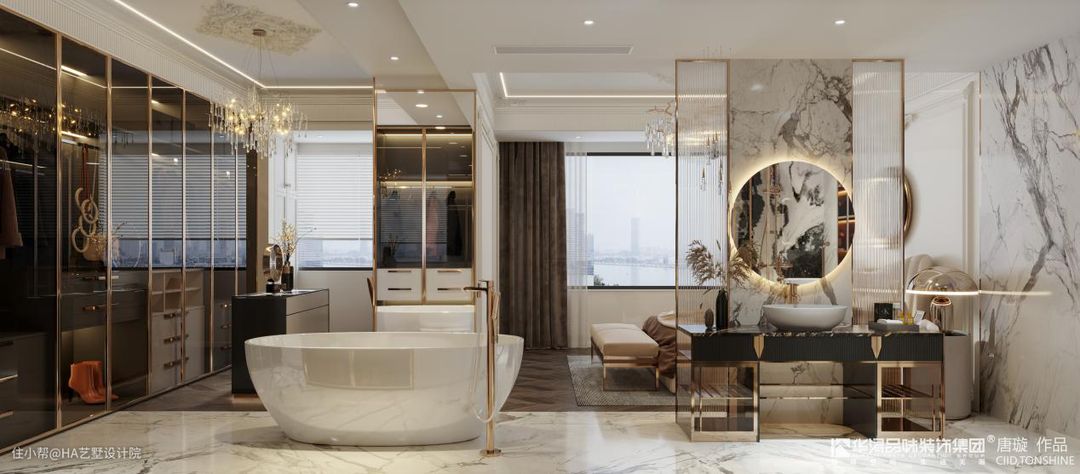 在隔断的另一侧,是一个集衣帽间梳妆间和浴室相结合的生活休闲空间。在这个空间的中间,安装了一个特别大的浴盆,业主可以在这里边泡澡边观察衣帽间里的服装,思考接下来要搭配哪些衣服。