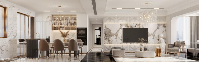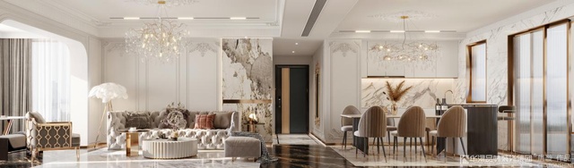客厅区域的其他墙面上,也使用了大量的欧式花纹白色护墙板,配合大理石,为整个空间营造出特别奢华的气质。客厅的沙发选用填充量特别大的欧式沙发。这种沙发尺寸宽大,非常柔软,人坐上去之后体验更加舒服,更能给人精致的生活享受。