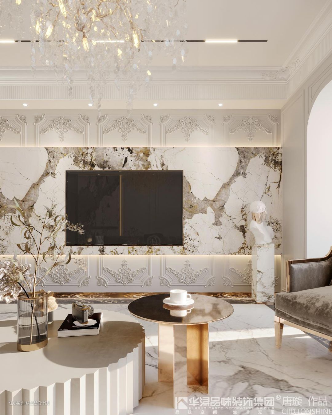 我们具体来看客厅。客厅的电视背景墙设计为前后两层,前面一层使用带大量花纹的白色大理石,大理石纹理生动,不拘一格。而后面一层使用人造的欧式花纹护墙板,这些花纹造型华丽,富有规则,更有秩序感。这样前后一静一动,对比非常强烈,给人极强的视觉冲击感。