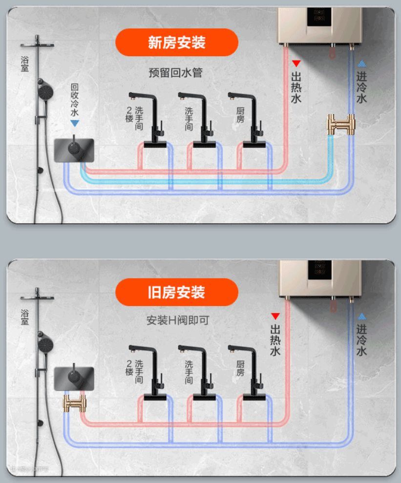 所有零冷水燃气热水器,都有两套循环方案——一套带回水管的,一套不带回水管的▼