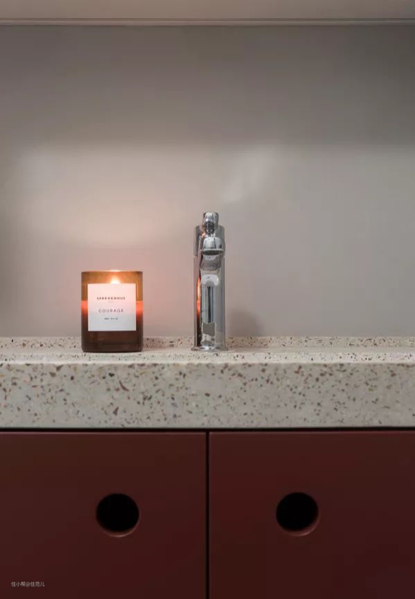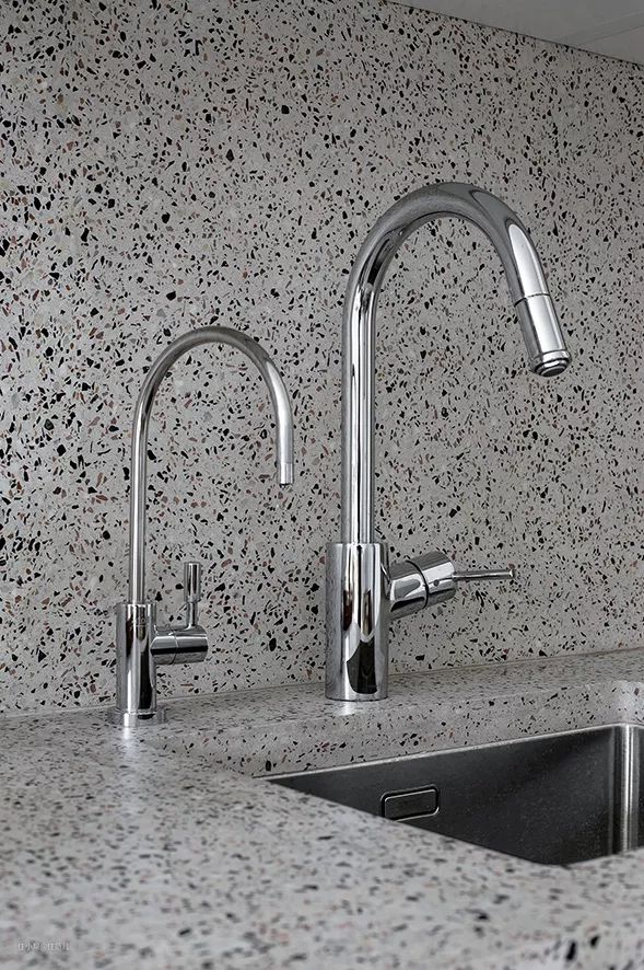 橱柜采用台面和防溅墙一体化设计,整体感更好,非常简洁,灰色调的水磨石不经意间流露出高级感。