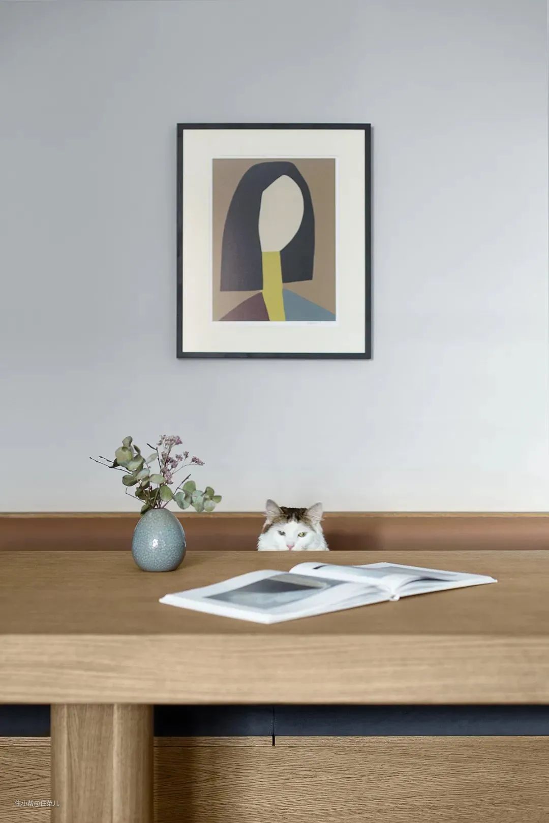 餐桌延申过去是一组吊柜,保证了储物空间的充足。