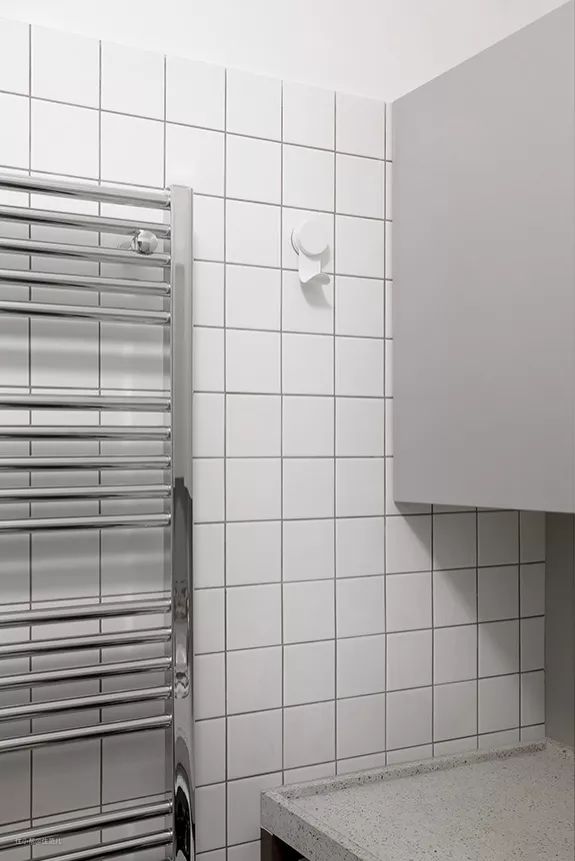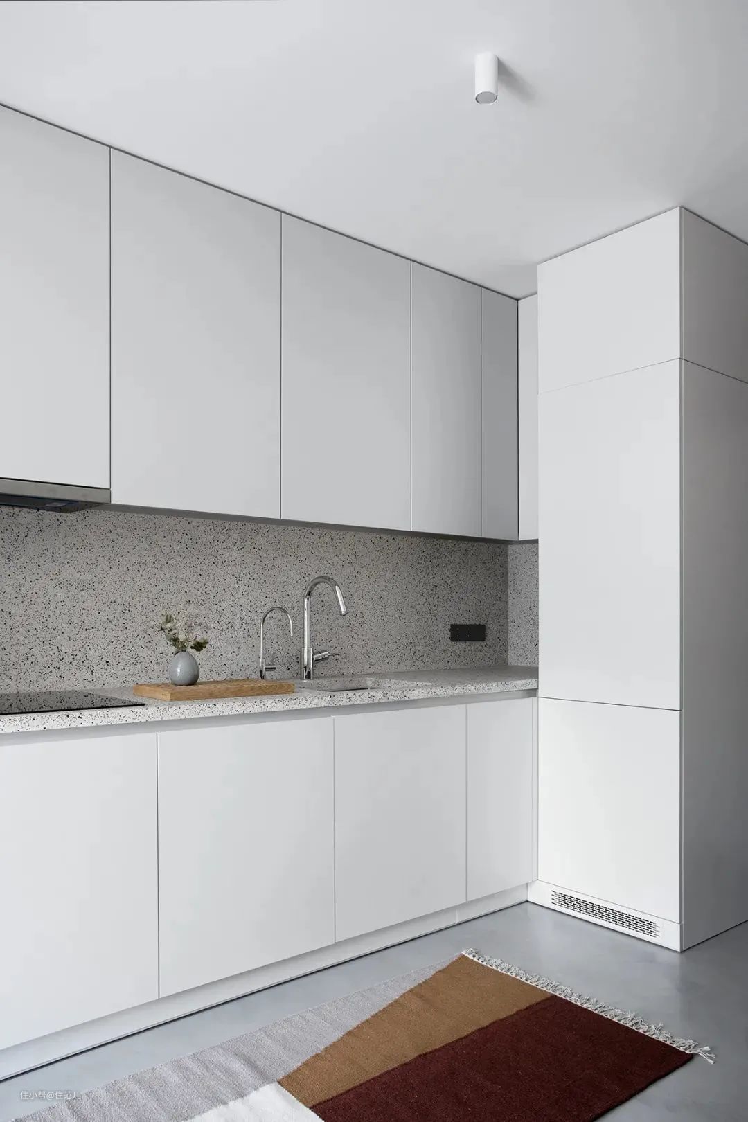 厨房的一端设有高柜,实用性非常强,白色无拉手的橱柜柜门强化了极简的氛围。