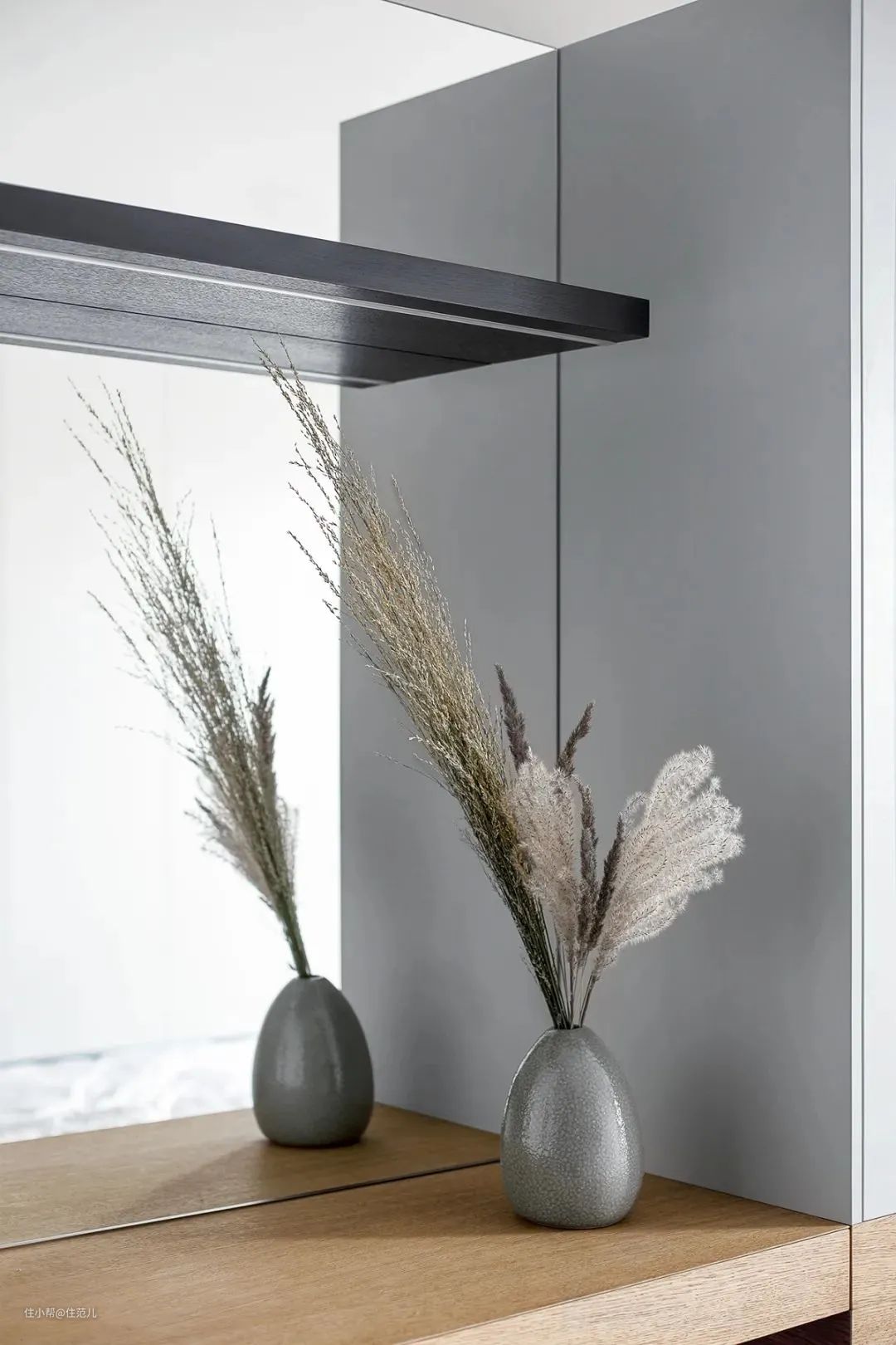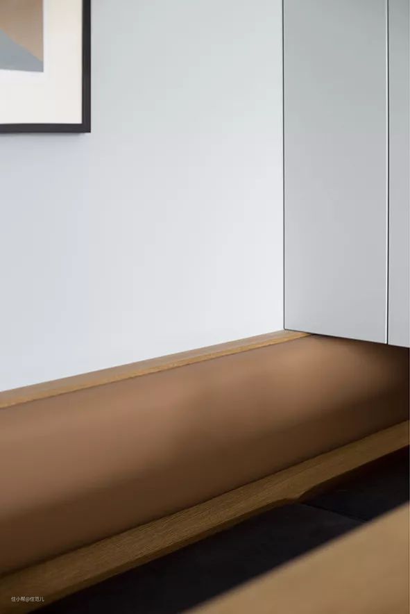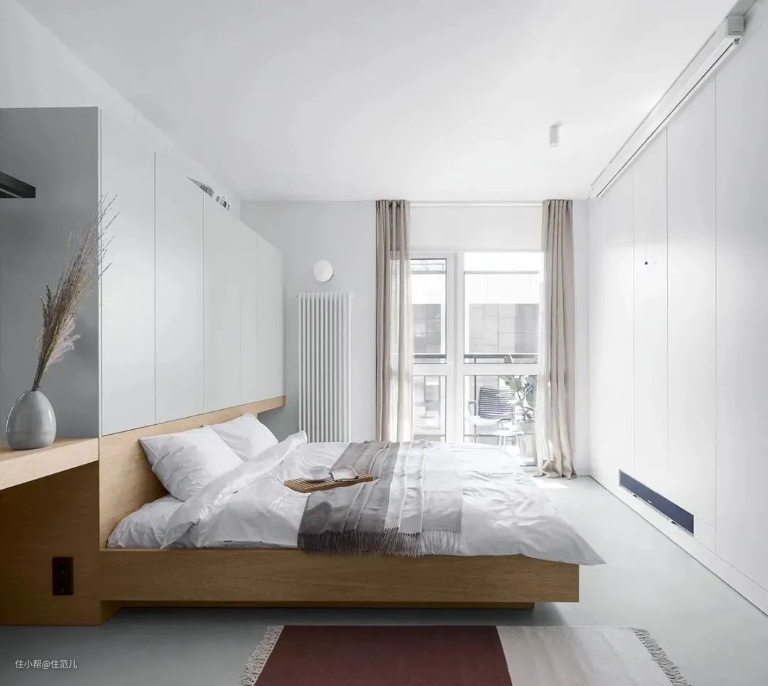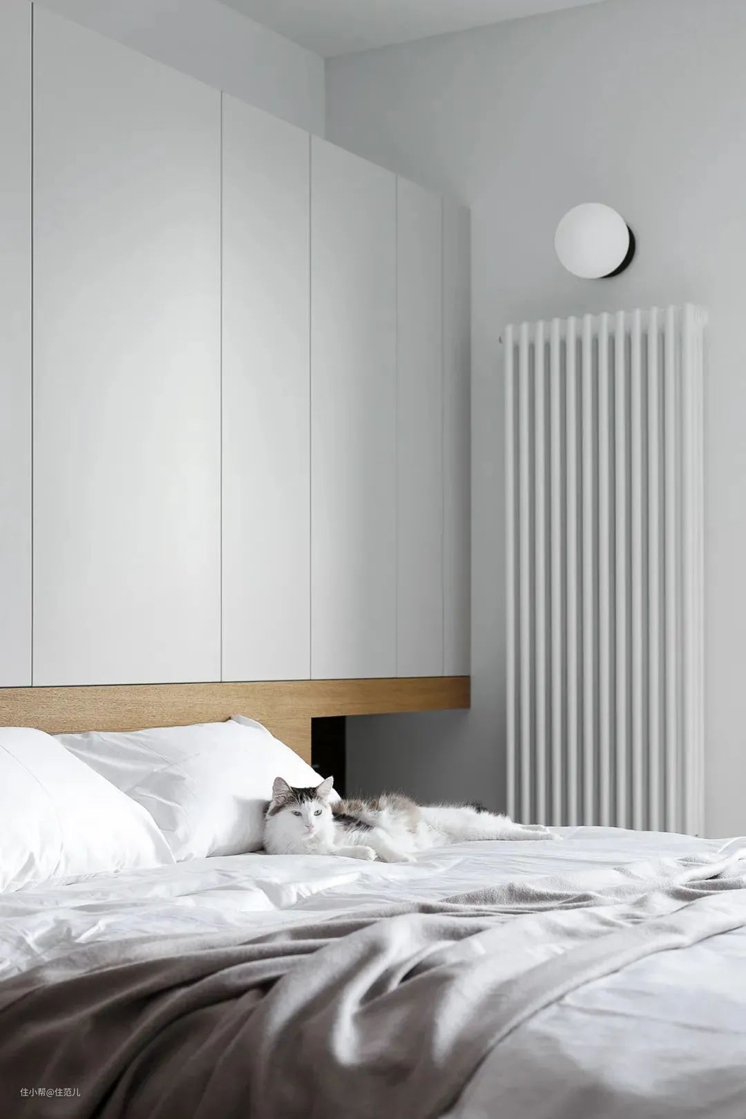 床头向上延申,成为吊柜,与餐厅的吊柜相连,整体感更好,卧室的收纳也更充足。