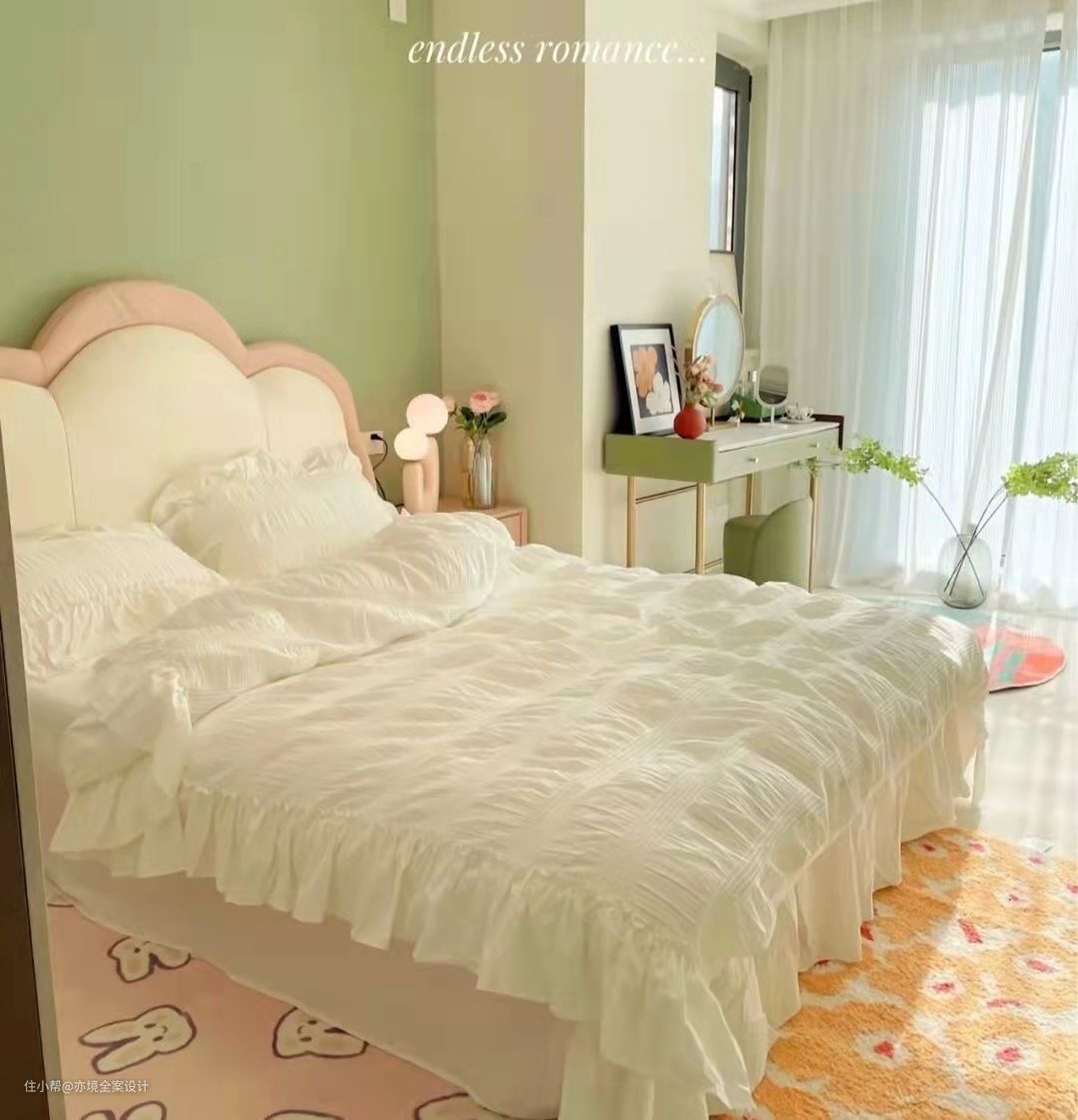 卧室的设计也是非常棒的,考虑到阳光照射卧室的时间我们特意选用了浅绿色作为床头背景的主题,女主人选用的特别可爱的床也是百搭哦