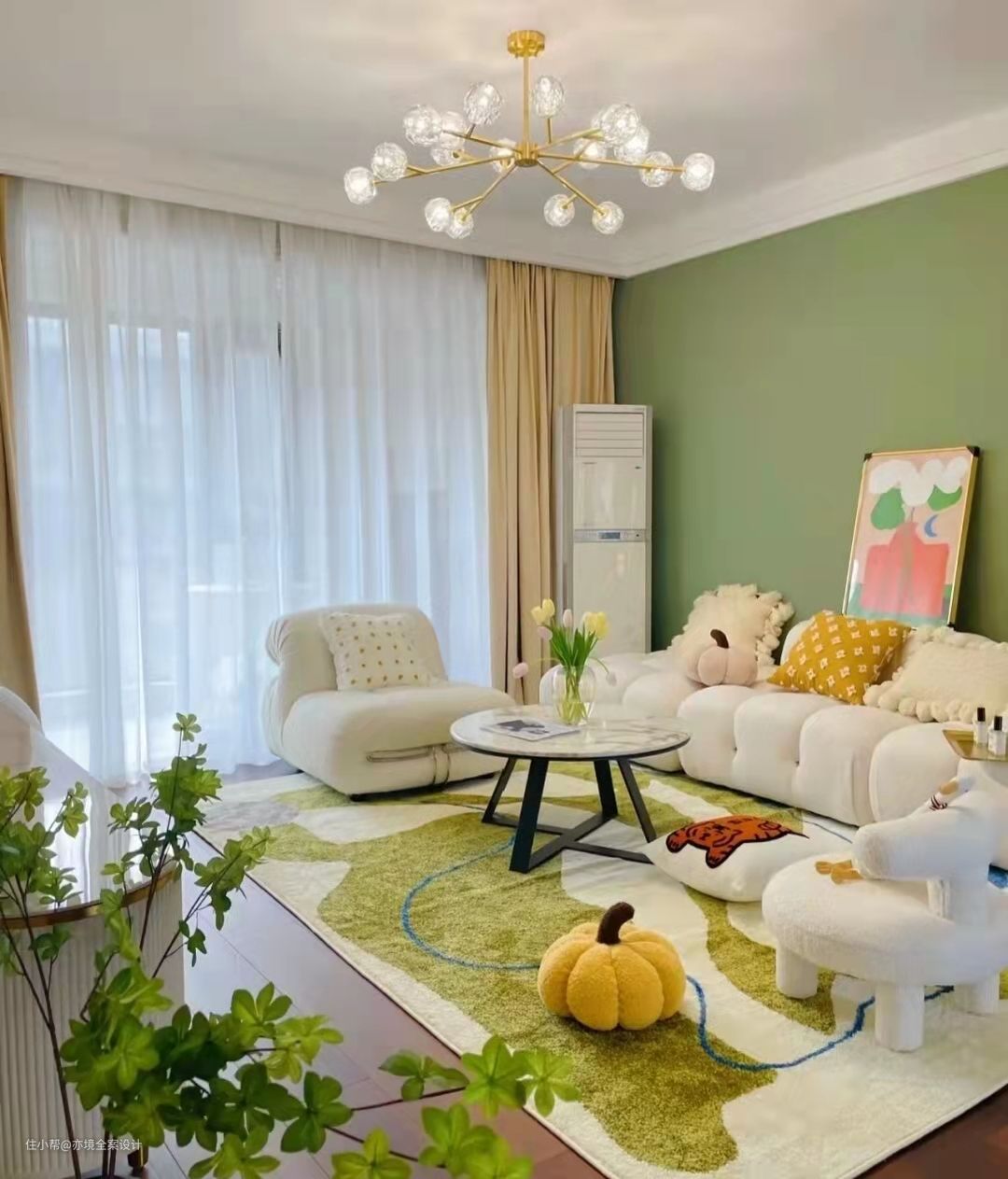 沙发背景实景;草墨绿搭配奶油白家具颜值爆棚哦。
