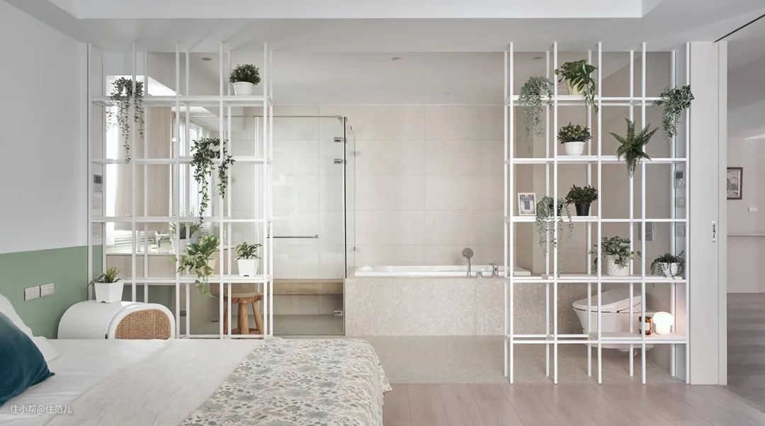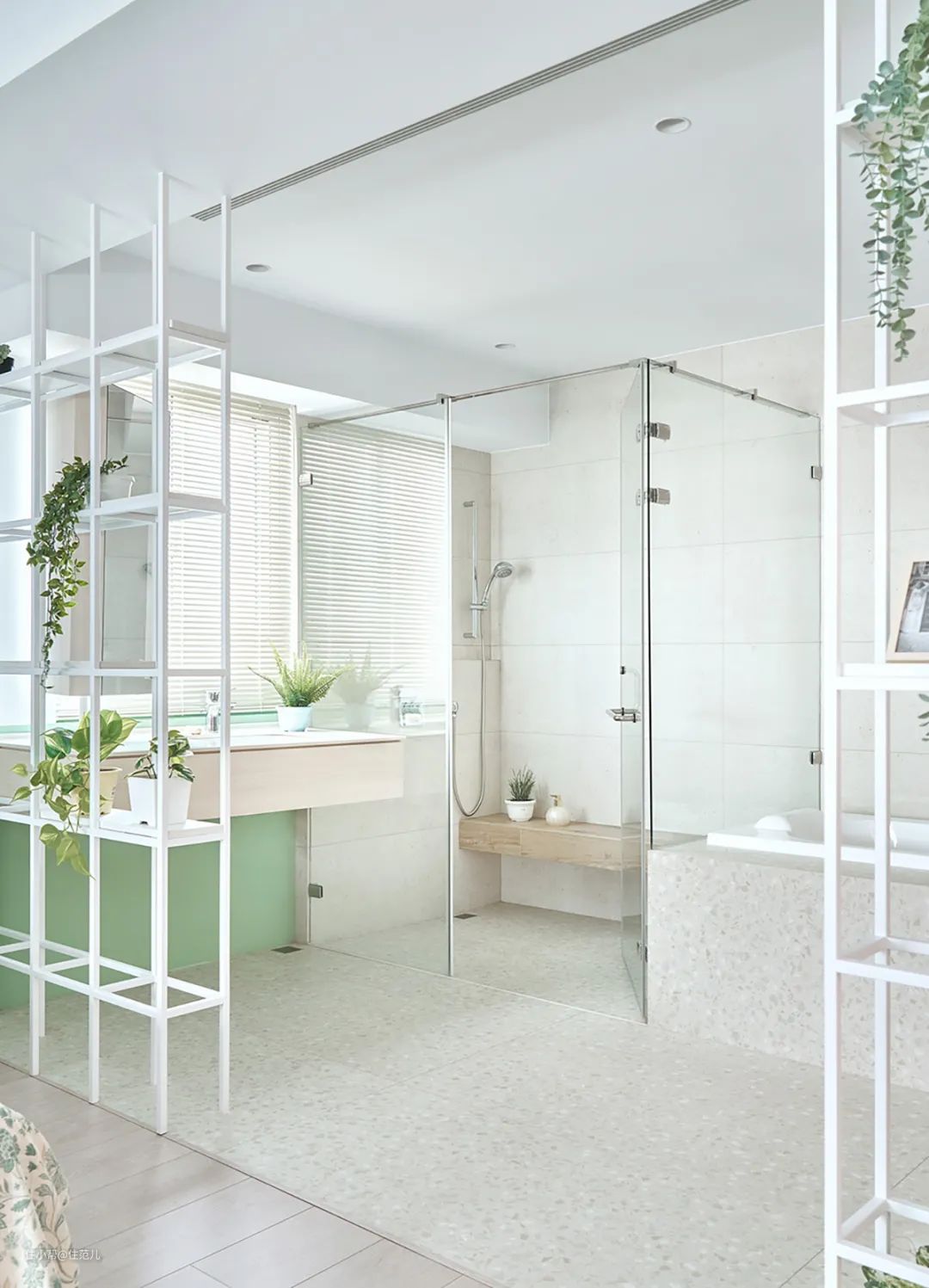 半遮蔽植物墙区隔卫浴,泡澡时也能欣赏钟爱的绿意是种享受。