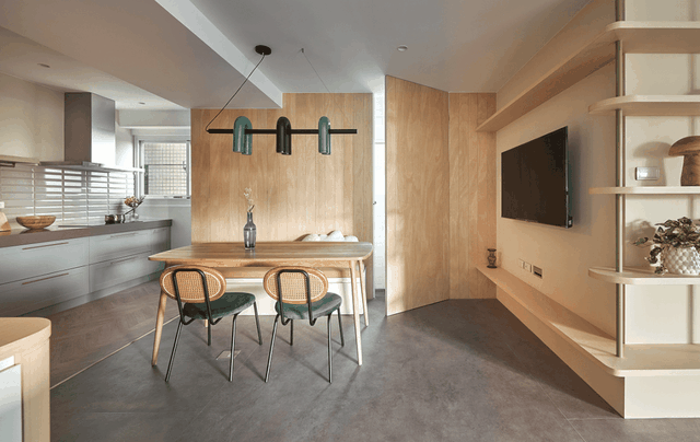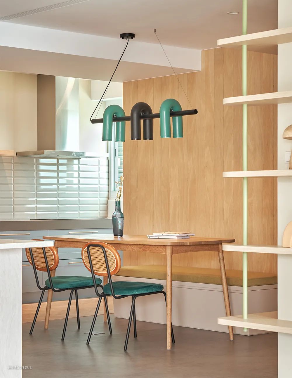 中西厨房的过渡地带是餐厅,原木质感壁面保有视觉温度,背后隐藏储藏室,同时整合电器设备线路。木色桌面搭配翠绿色餐椅和灯饰,隐含精致质感及清新气息。