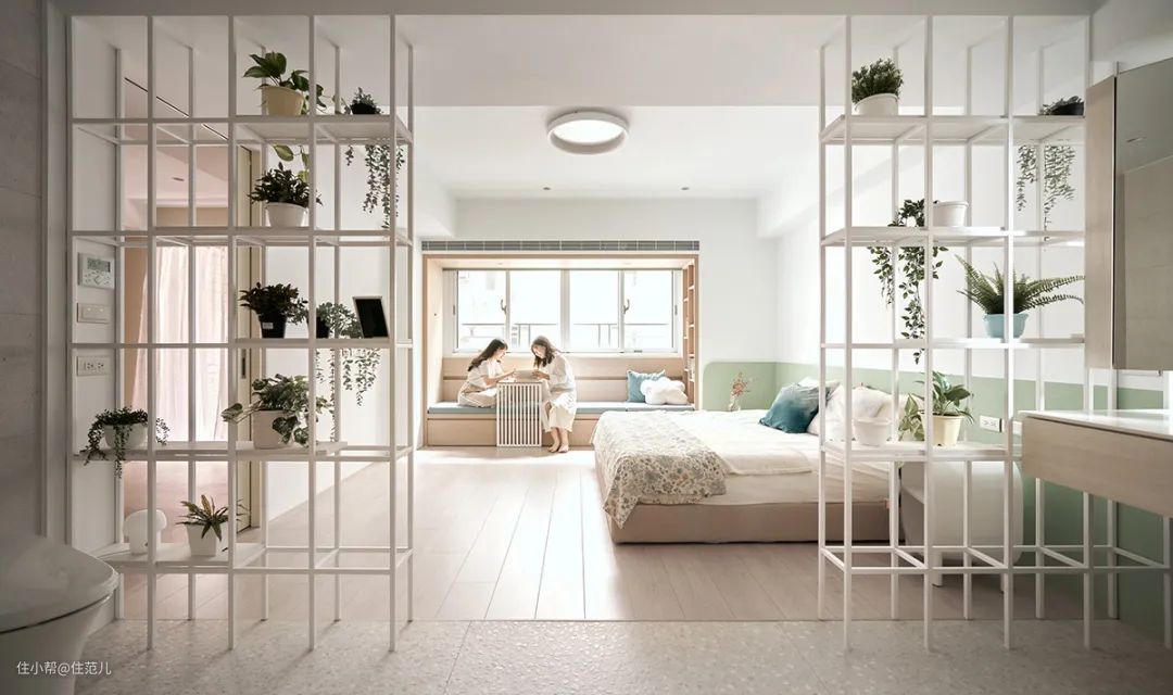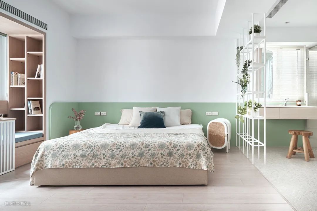 女主卧:设计师为喜爱花草的女主人,以薄荷绿做为主卧配色,穿插浪漫碎花织品和翠绿植物,营造卧室的清爽感。