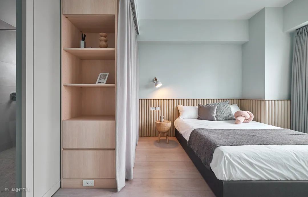 男主卧:男主人喜欢简洁利落,卧室延续女主卧的薄荷绿色系,其余保持简单线条,仅以柔软的线条状床头软包呵护头部,入门处以拉帘收纳衣物和个人物品。