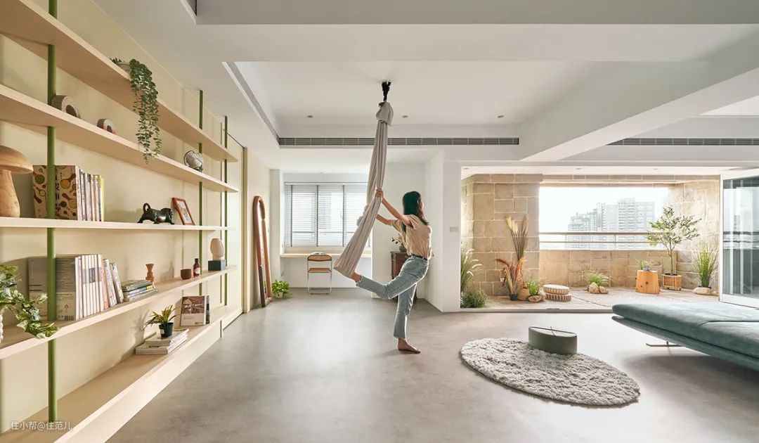 衔接厨房的区域留了一处空白,窗边阳光缓缓流进室内,悬挂在天花板的瑜伽绳让女主人随时舒展身心。