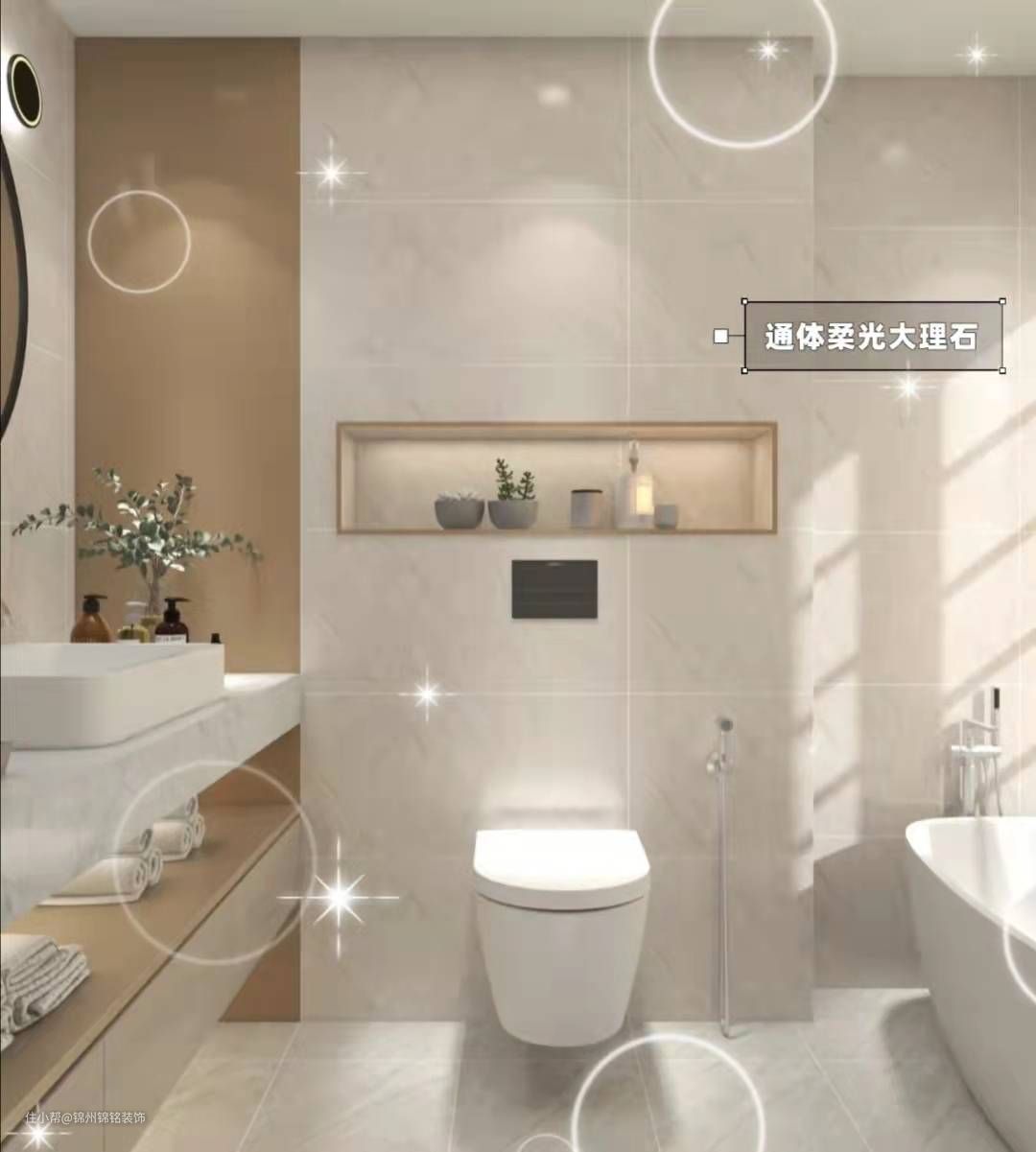 灯光也是很重要的,灯光好看整体才会出效果,选择暖白或者暖黄色系的色温灯光,卫生间看起来更温馨。避免选择白光冷光,颜色很重的灯光。
