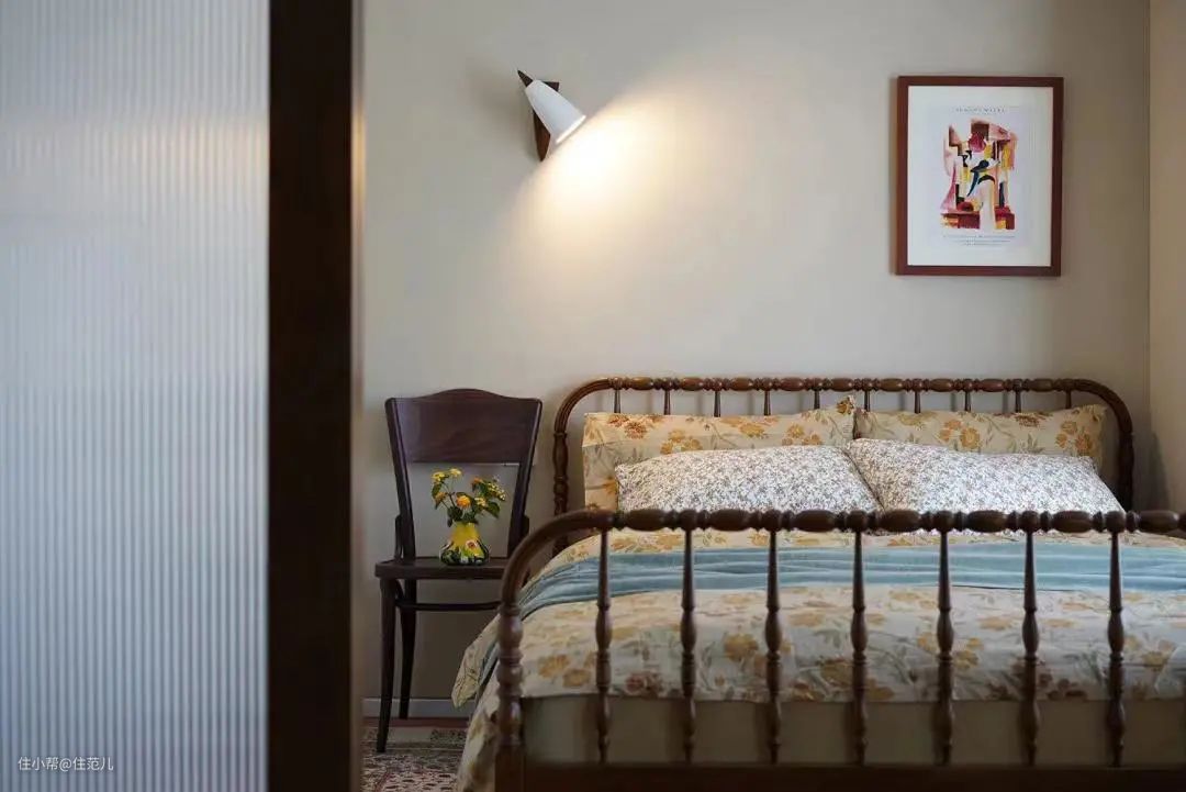 在这个案例中,主卧也因为有着雕花造型的海蒂床和花床单,而更显温馨和与众不同。