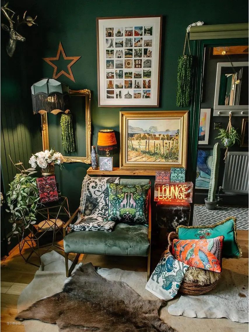 有了较重的色彩之后,可以适当选择有特色的家具和装饰来充实整体,让极繁锦上添花,但是要注意适当留白,形成一些视觉焦点的同时,不会觉得过于视觉疲劳。