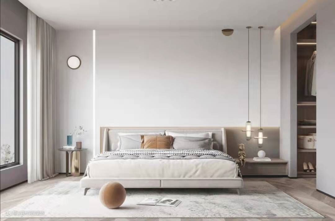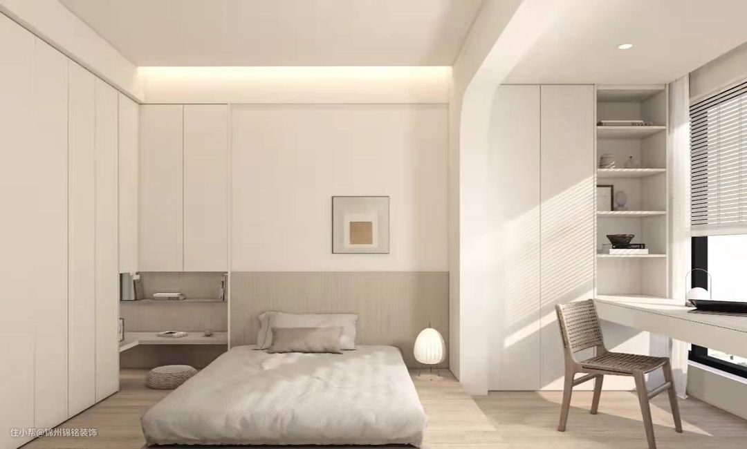 (1)卧室应采用“轻装饰”的原则,减少固定笨重的装饰,“达到配置上的精致实用。收纳就是很重要的点,如果卧室空间较小,就要考虑嵌入式的衣柜以及背景墙这类具备隐蔽性的位置,尽可能的不占用中心空间。