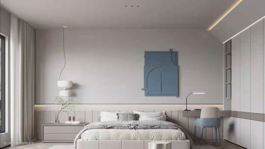(2)卧室的墙面造型不宜太复杂,然为了造型而造型的墙面,不仅实用性低,还容易产生审美疲劳,因此应该采用种多元化的应用,简单的线条搭配几何造型的融入,搭配莫兰迪色系的卧室色彩。