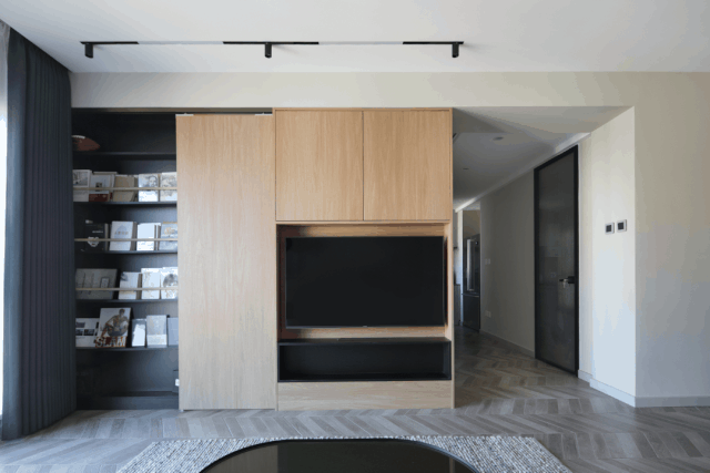 进门右手边是一间小暗室,平时可以用来做收纳间,鞋子,行李箱通通放里面。用了浅灰色的木头做柜门,维持整体的视觉美感。