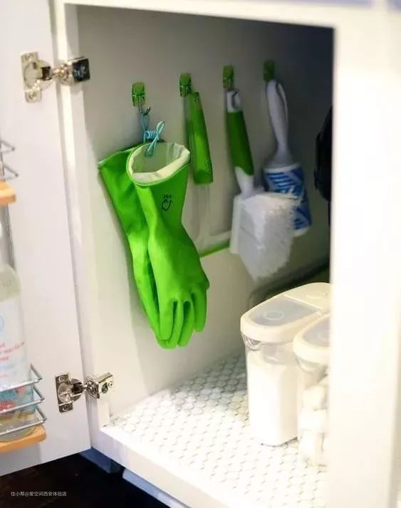 柜板后:用挂杆或免钉挂钩收纳清洁剂、刷子、垃圾袋、海绵、锅盖等。