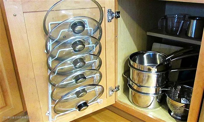 不需要专门的收纳架,锅盖用挂钩或挂杆就能解决