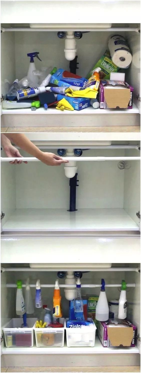 免钉挂杆不只是能挂东西,还能帮助收纳盒悬空固定在水槽下