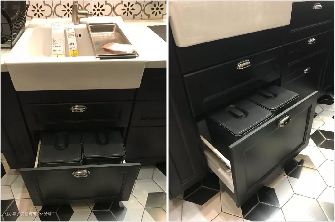 如果日常厨余垃圾很多,那就简单粗暴,把水槽下当做垃圾处理区,设置加盖压缩分类垃圾桶。像上面所说,建议安装滑轨、踢脚开关装置。