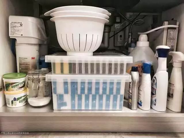 最下层:较大陶瓷容器、罐子、锅具、垃圾桶、备用纯净水,还可以横向划分区域,用收纳箱分割。