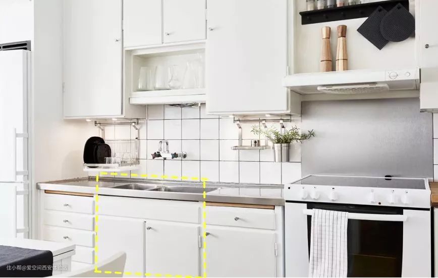 在台面占地、但又不需要专门开辟收纳区的囤积品或者不常用杂物,可以优先放在水槽下。