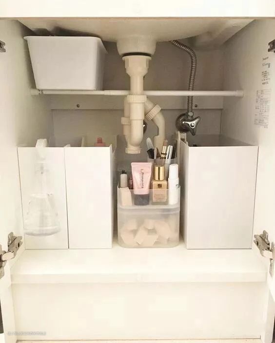 除此之外,就是网上可以买到的各种尺寸的收纳盒,在方便拿取使用、方便管道维修的前提下,想方设法把空间填满。