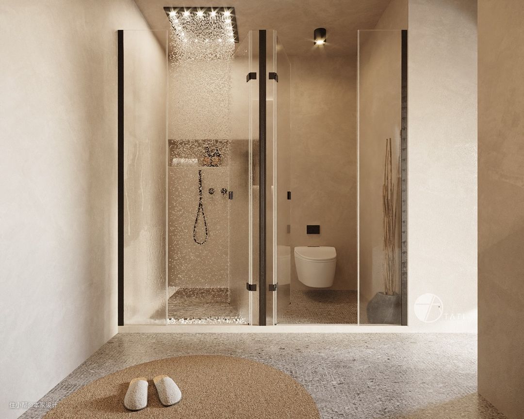 一旦穿过拱门,一个白色的混凝土梳妆台就会延伸到一面活边镜子下面。玻璃墙卫生间与淋浴房相得益彰。