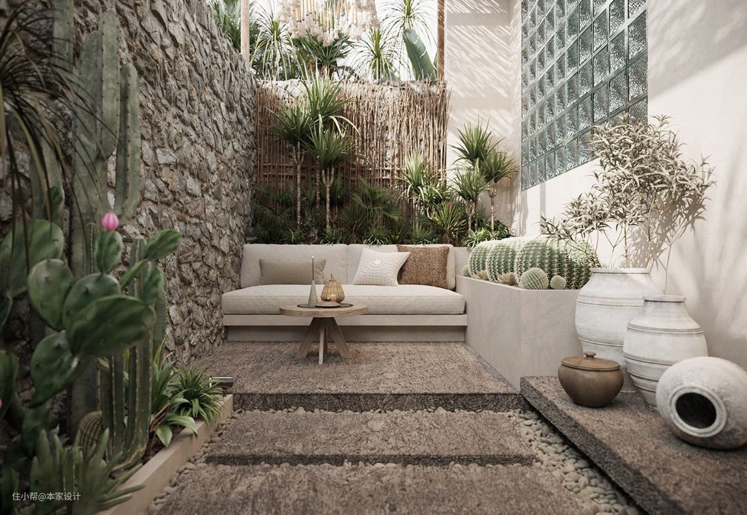 在露台的尽头,一个内置的沙发槽位于质朴的石墙和一个装满桶形仙人掌的凸起花盆之间。