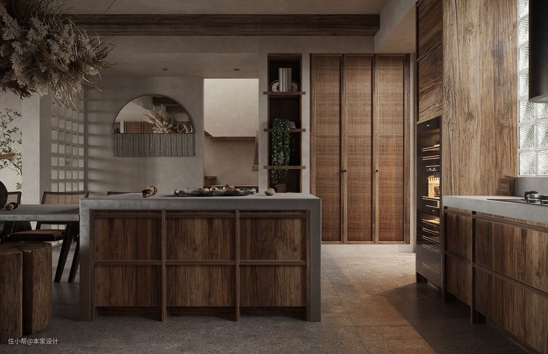 浇筑混凝土在房间的后面也建造了厨房工作台,与质朴的木制底座和开放式厨房搁架的墙壁完美搭配。
