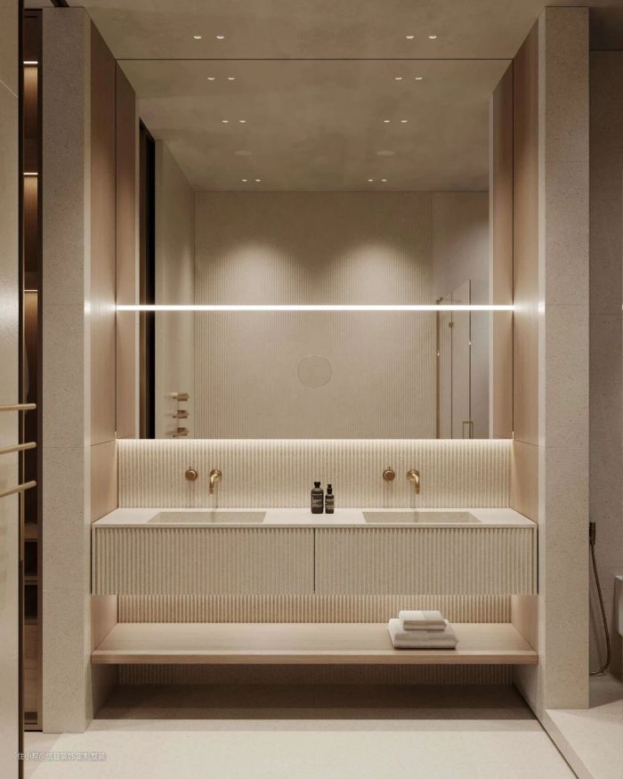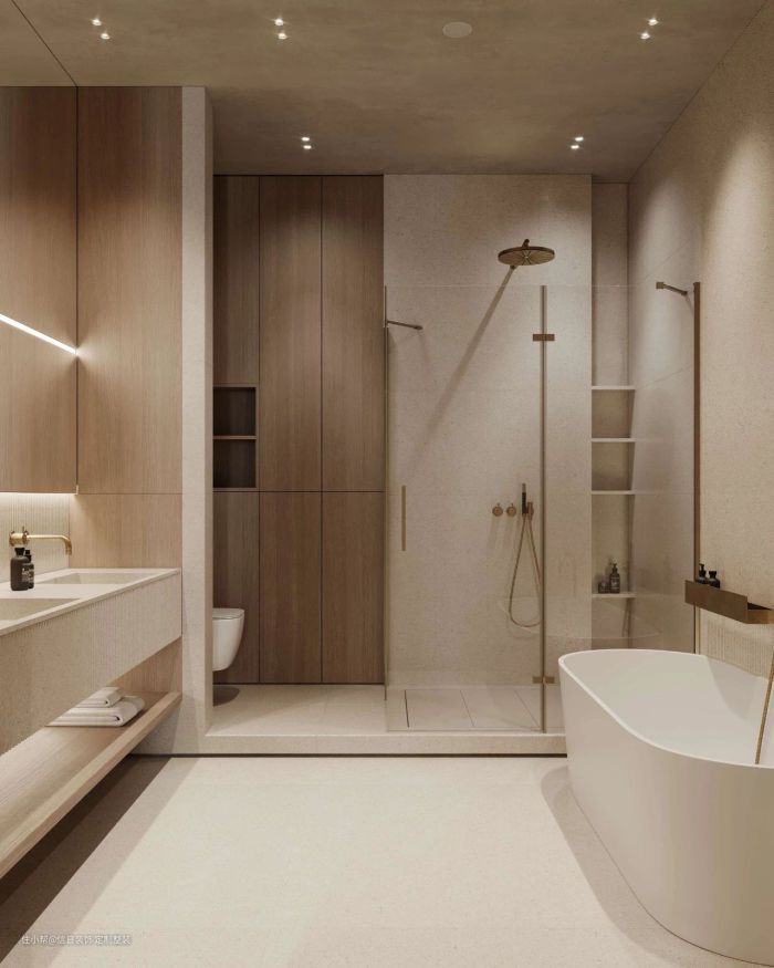 卫生间简约温馨的色彩和自然元素的巧妙运用,点缀了卫浴间的设计风格,立刻展现出主人对高端生活的艺术品味。