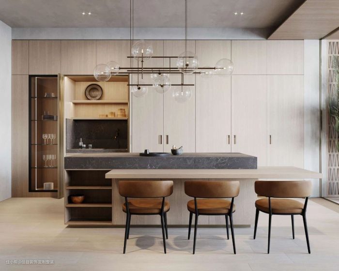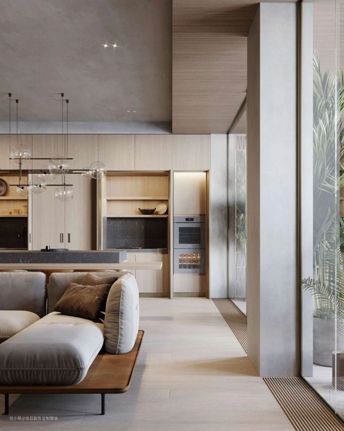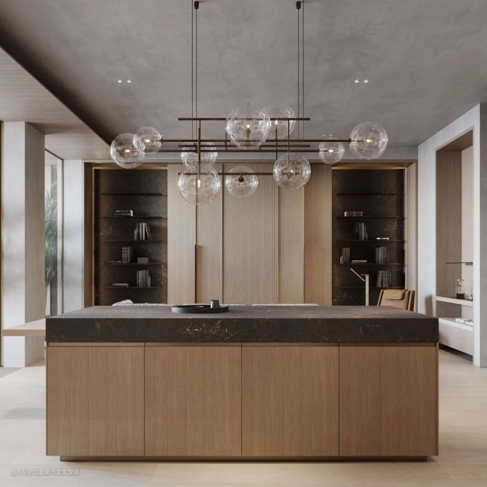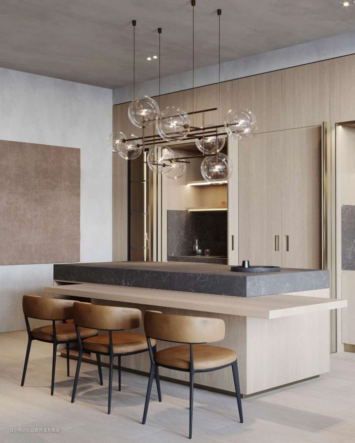 设计中的节点关系存在于材质、比例、光影和色彩的边界感。餐桌和石岛台的互穿叠搭打破了内敛的边界,加上简约的圆形吊灯,气质会有很大的变化。