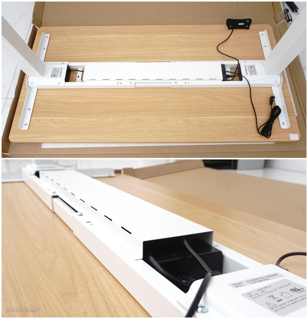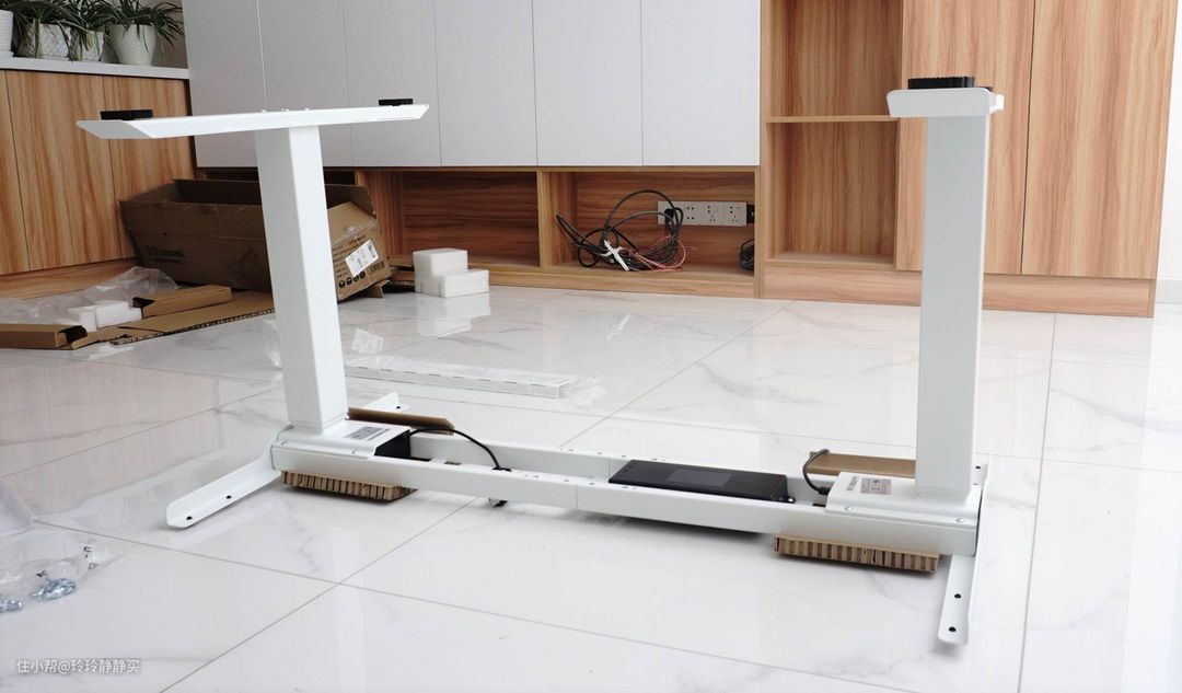 按说明书,先把支撑板和支撑横梁相连,再把桌腿和桌脚安上。控制盒、电机都已经安装好了,不用额外安装。倒过来安装时,泡沫和纸板垫在下面会方便很多。