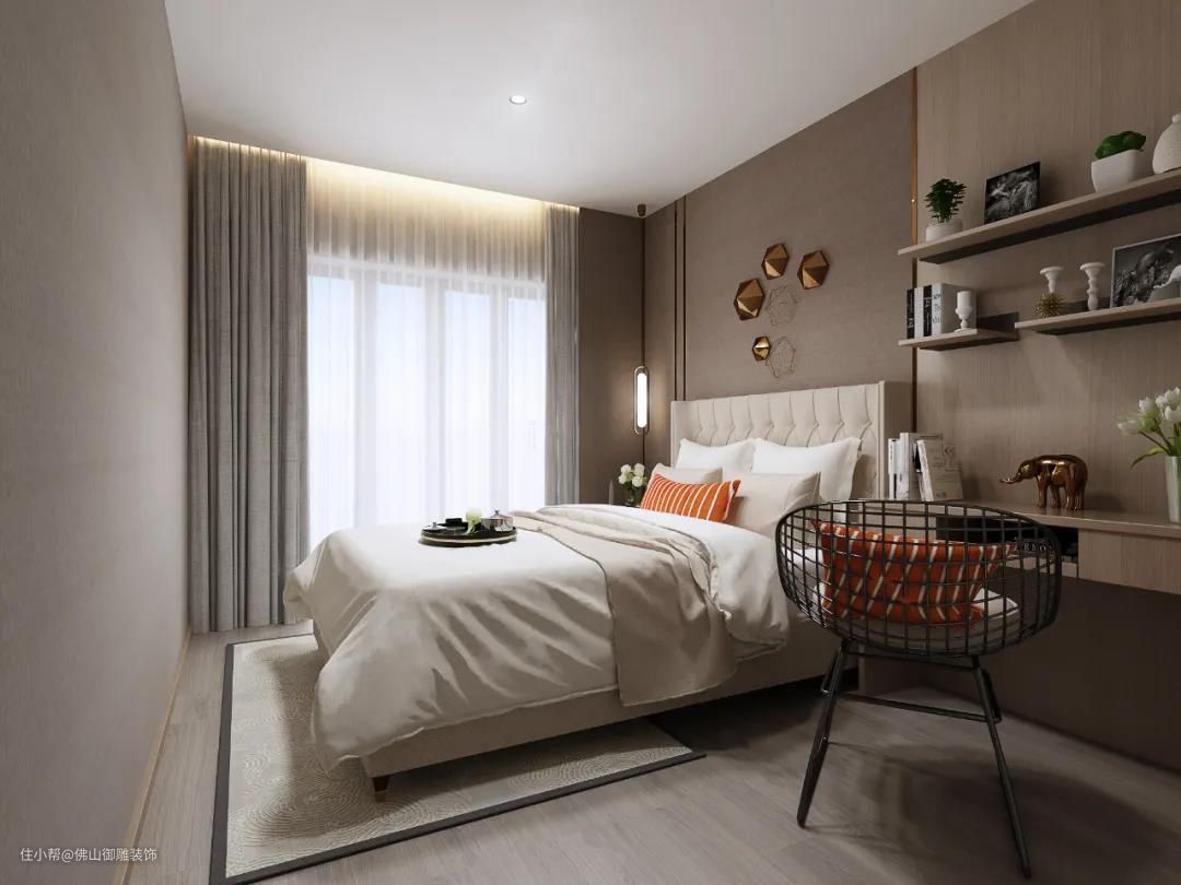 如果床尾这面墙的长度比较大,并且对卧室的功能需求比较多,也可以采取组合柜的形式,在床尾上安装衣柜+书桌/梳妆台的组合柜设计,实现衣物收纳与书桌/梳妆的多种功能。